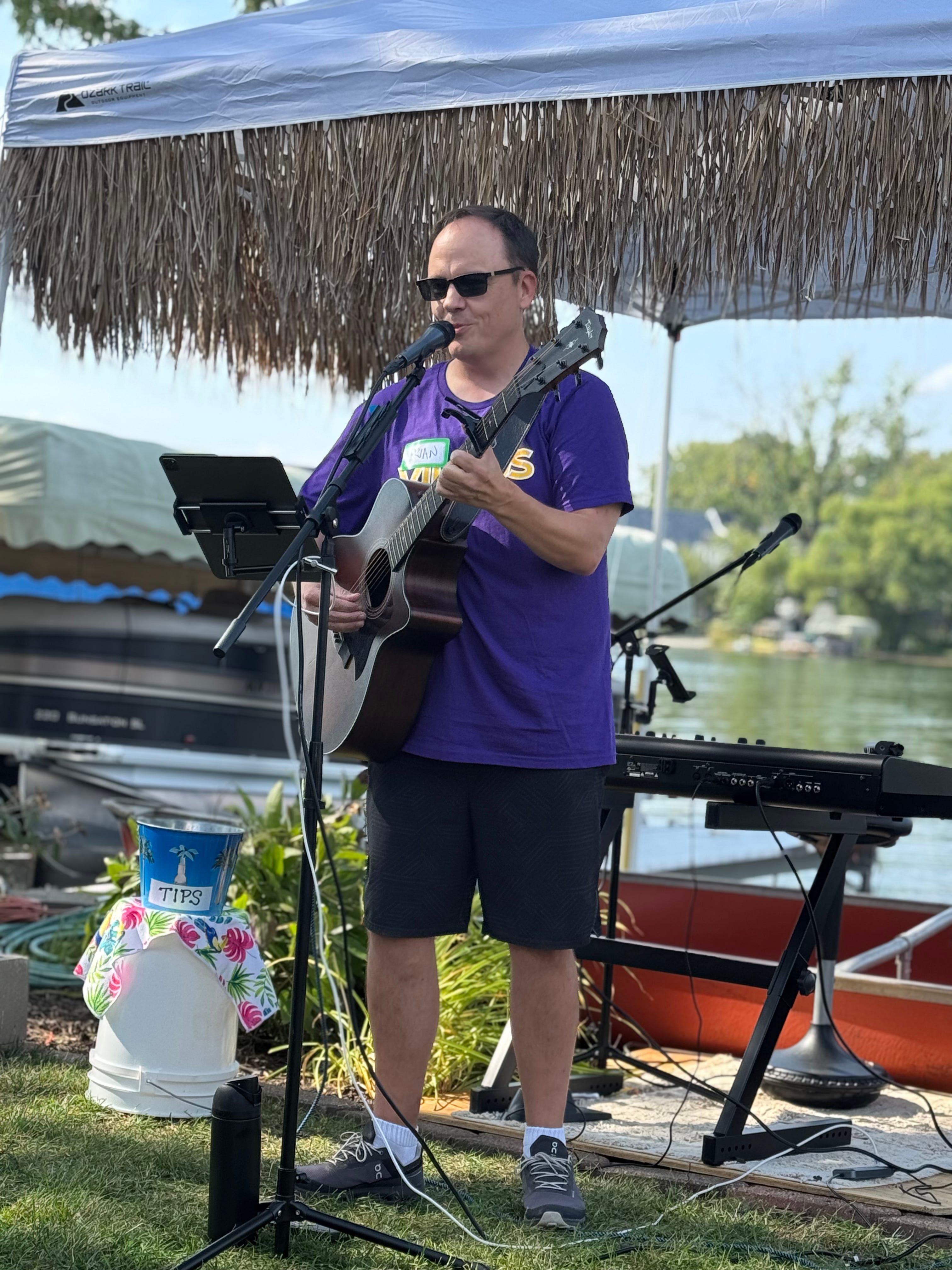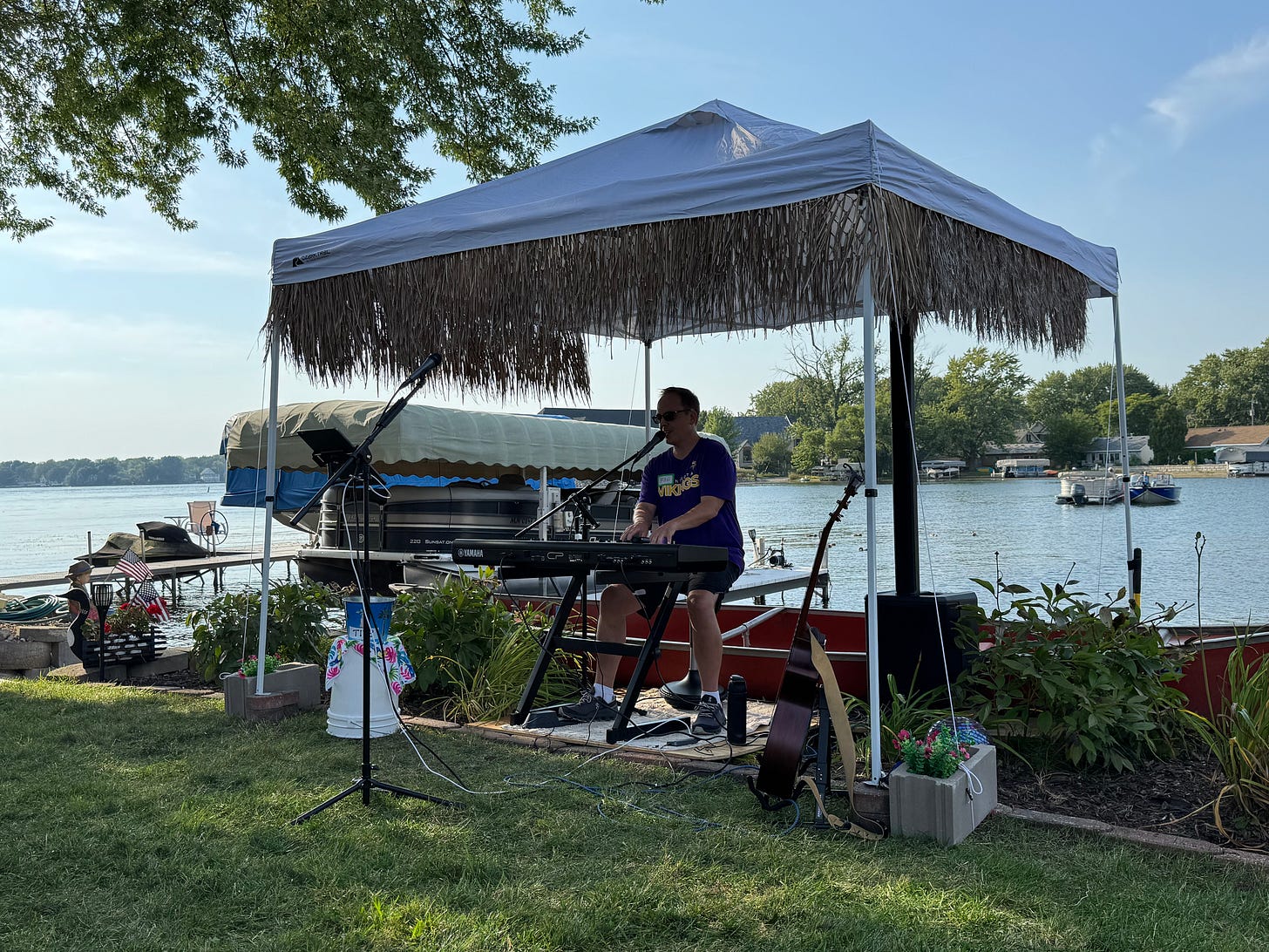 My first-ever lakeside concert went so well! And that’s not a brag, that’s me expressing extreme relief. Reason being is I thought this was a “I’ll play music while everybody mingles and munches on food” kind of thing, when it actually was positioned as more of a “Turn off your cell phones and don’t talk and also please stare at Brian while he sings and sweats under the hot sun” kind of thing. Here’s a pic (the host even made me a cool stage with canopy and tip jar):